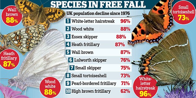 This graph from the Daily Mail demonstates the scale of the losses of ten butterfly and moth varieties from 1978 through 2016. In just four decades, certain species native to Britain have been decimated between 62 percent and 96 percent.